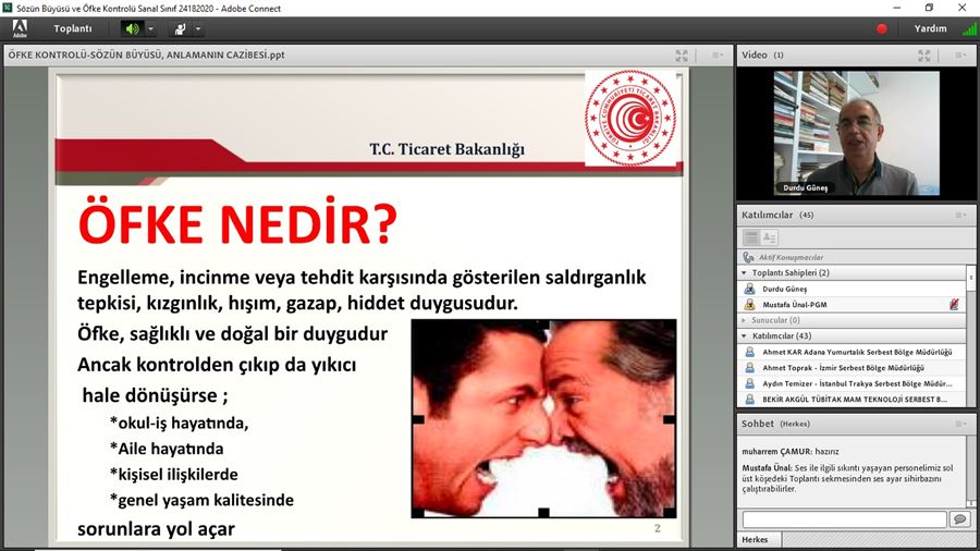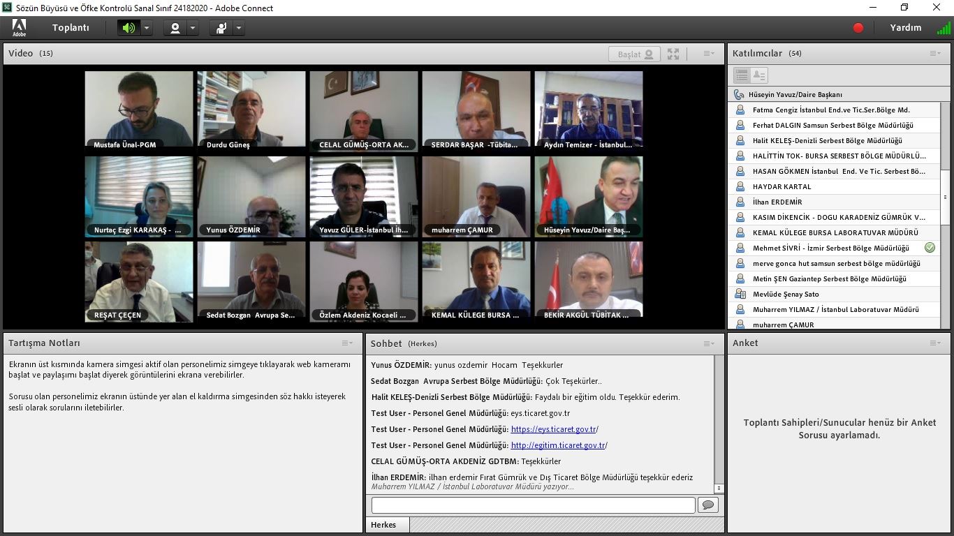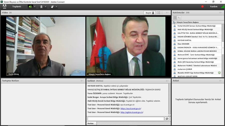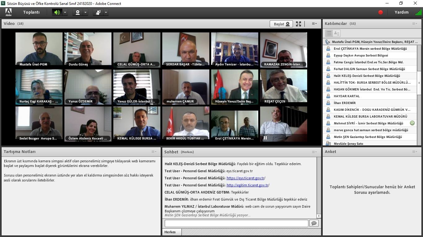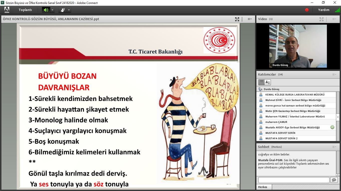 26 Haziran 2020 Ticaret Bakanlığı Serbest Bölge Müdürlüklerinde görevli Serbest Bölge Müdürü, Serbest Bölge Müdür Yardımcısı ve Gümrük ve Dış Ticaret Bölge Müdürlüklerinde görevli Laboratuvar Müdürü unvanlarındaki personele yönelik Sözün Büyüsü ve Öfke Kontrolü Eğitimi düzenlendi.