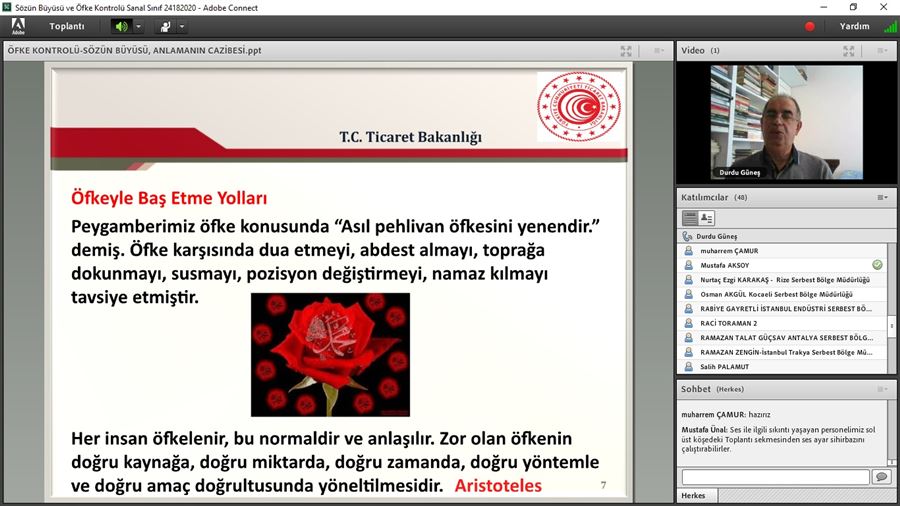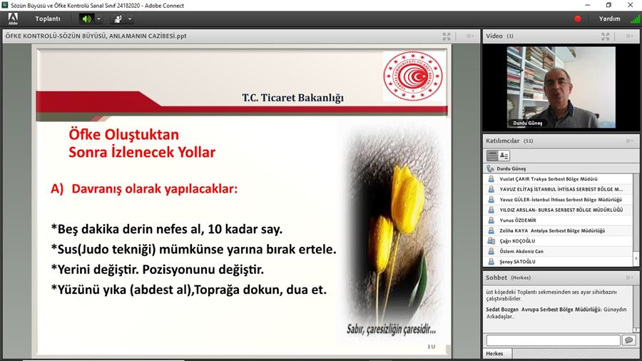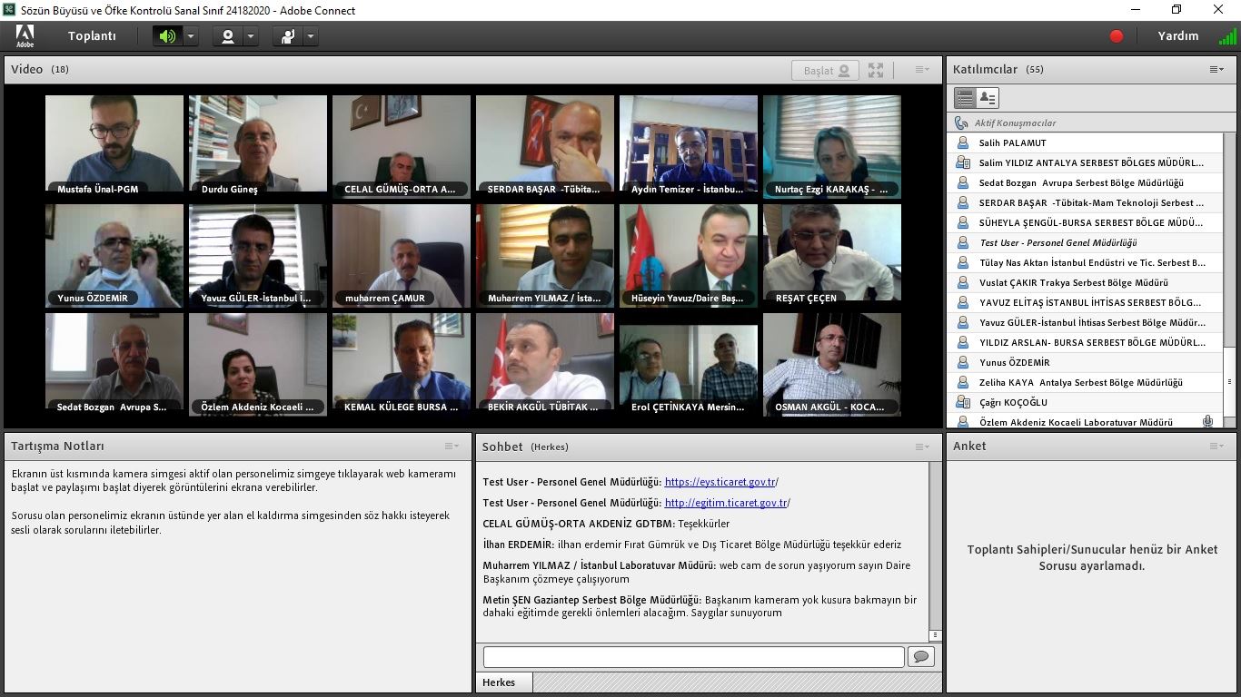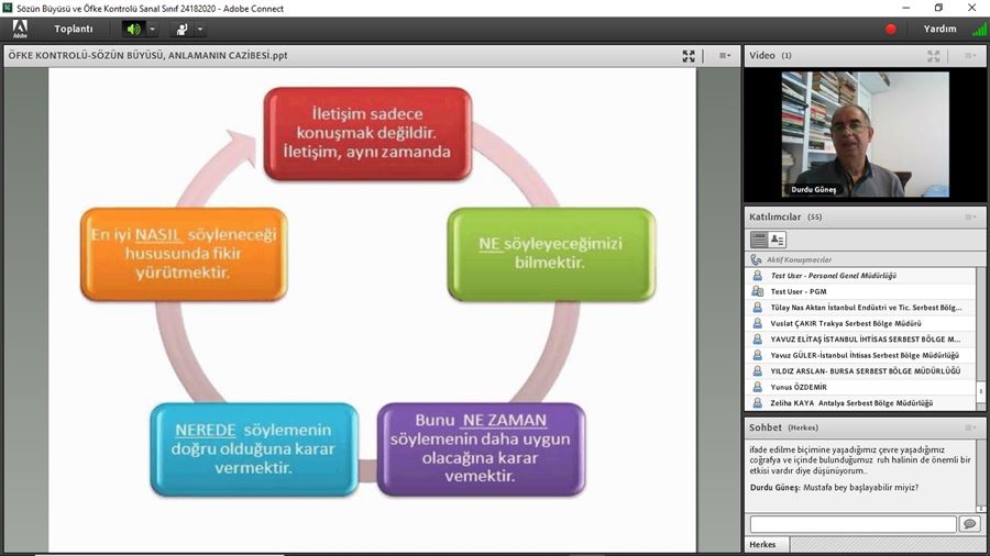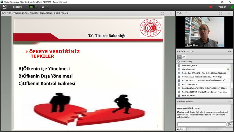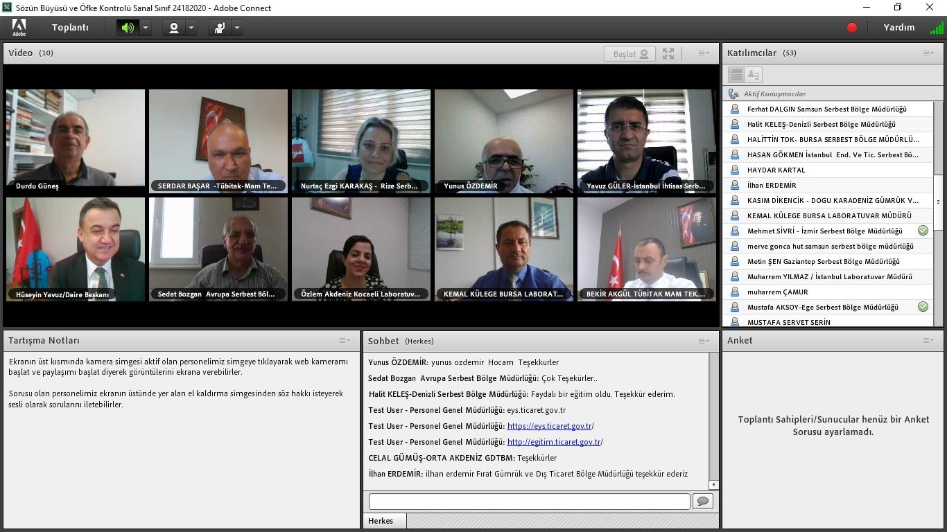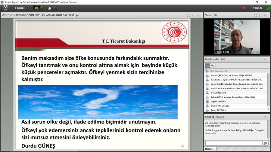 26 Haziran 2020 Ticaret Bakanlığı Serbest Bölge Müdürlüklerinde görevli Serbest Bölge Müdürü, Serbest Bölge Müdür Yardımcısı ve Gümrük ve Dış Ticaret Bölge Müdürlüklerinde görevli Laboratuvar Müdürü unvanlarındaki personele yönelik Sözün Büyüsü ve Öfke Kontrolü Eğitimi düzenlendi.