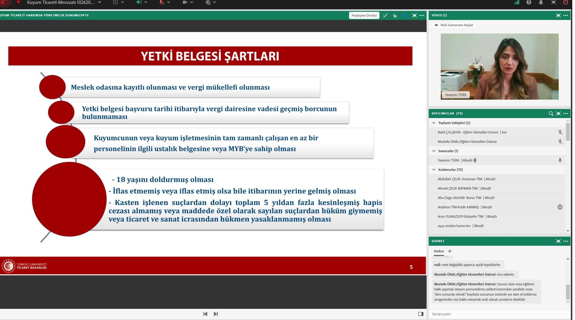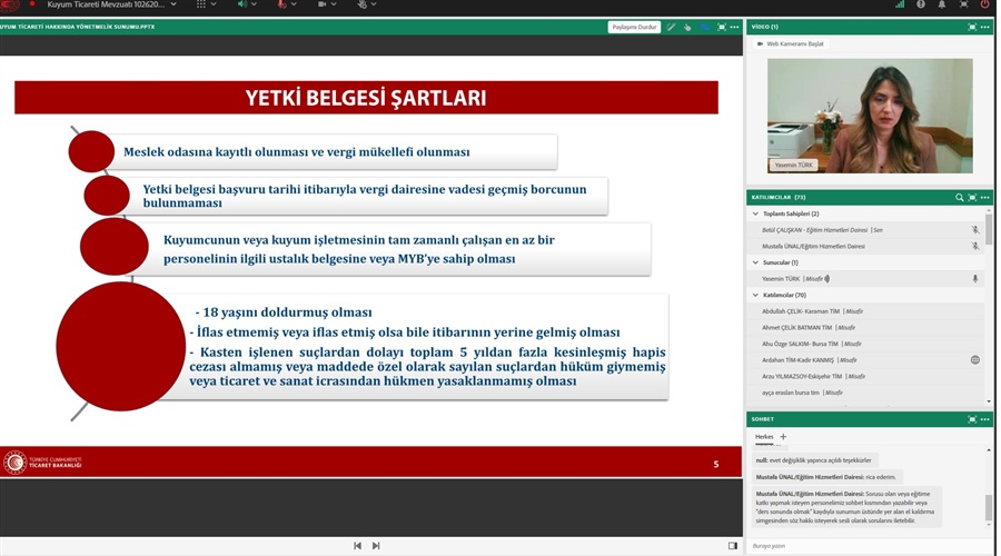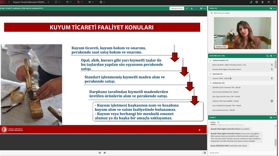 Bakanlığımız Ticaret İl Müdürlüklerinde görevli personele yönelik düzenlenen Kuyum Ticareti Mevzuatı, Yetki Belgesi Başvuru Şartları ve İstenilen Belgeler Eğitimi sona erdi.
