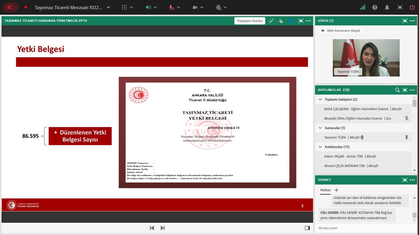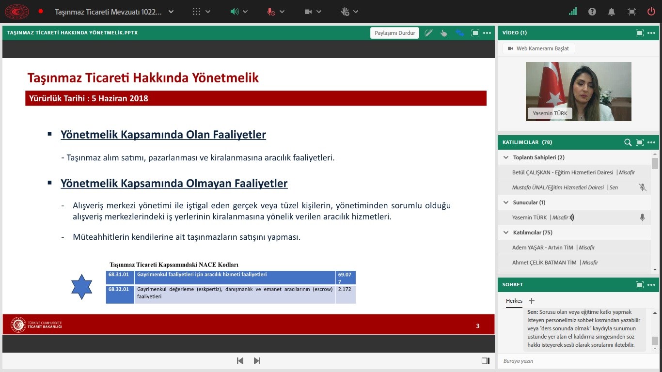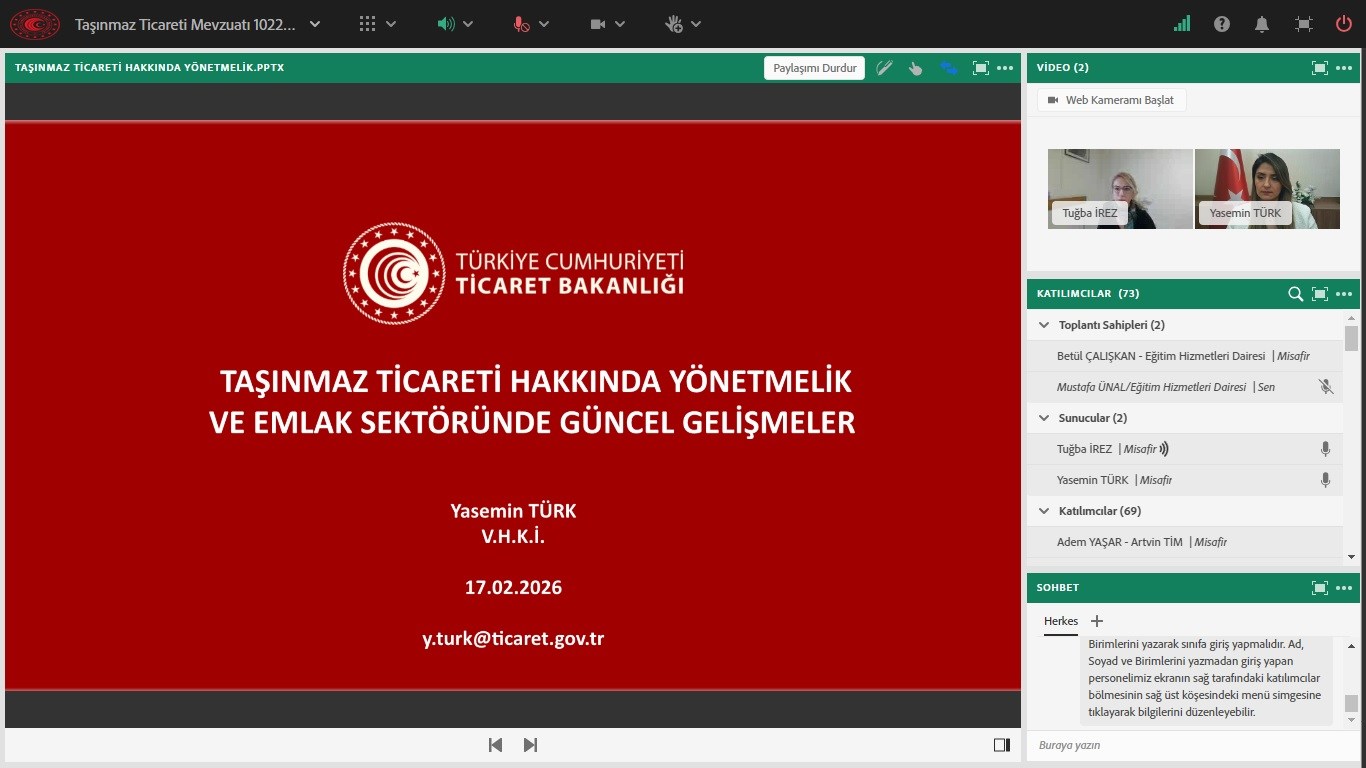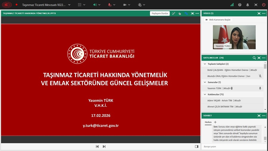 Bakanlığımız Ticaret İl Müdürlüklerinde görevli personele yönelik Taşınmaz Ticareti Mevzuatı, Yetki Belgesi Başvuru Şartları ve İstenilen Belgeler Eğitimi yapıldı.